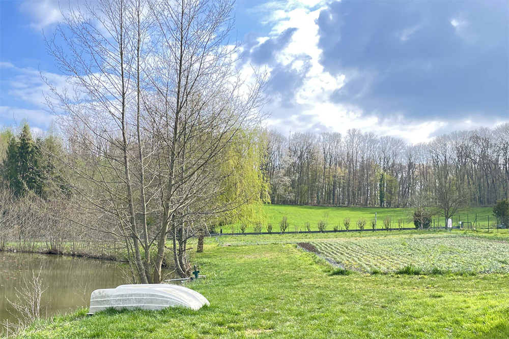 Idéalement situé à l’écart du village, entre forêts et champs, le lieu-dit Lochmatten (littéralement ‘le trou du pré’, en référence aux deux étangs située sur l’exploitation) bénéficie d’une exposition ensoleillée, d’une terre naturellement riche qui n’avait jamais été exploitée auparavant, d’une ressource en eau raisonnée grâce aux étangs et aux multiples récupérateurs d’eau de pluie présents sur l’exploitation.