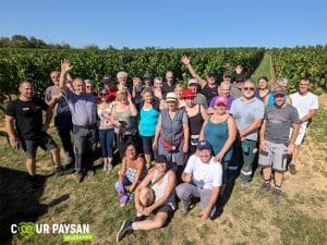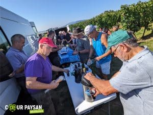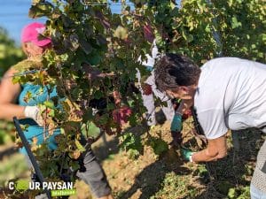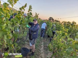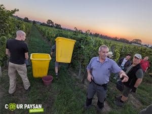 Le ciel revêt encore ses couleurs pastel quand tout le monde est prêt, moins d’une demi-heure plus tard, devant les vignes, à l’entrée de la Vallée Noble. Martin Klein place la bonne vingtaine de vendangeurs par rangées tandis que Guillaume, son fils, répartit les grands bacs jaunes.
