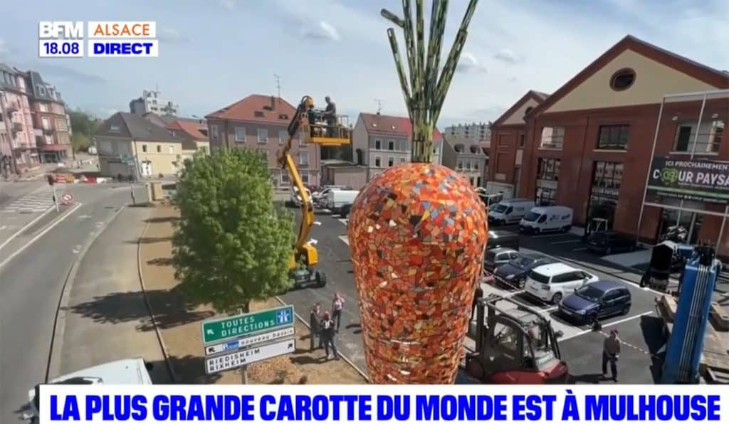 Une carotte alsacienne bientôt dans le Guiness des Records? Ce jeudi, une carotte en céramique haute de 9,60 mètres et lourde de 2,5 tonnes a été installée rue de Bâle à Mulhouse.