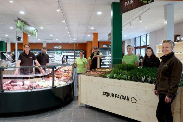 À Colmar, Cœur Paysan est dans un ancien Lidl. À Mulhouse, c’est dans l’ancien bâtiment industriel reconverti en Chronodrive (groupe Auchan), fermé en novembre 2013, que s’installe ce magasin pas comme les autres.